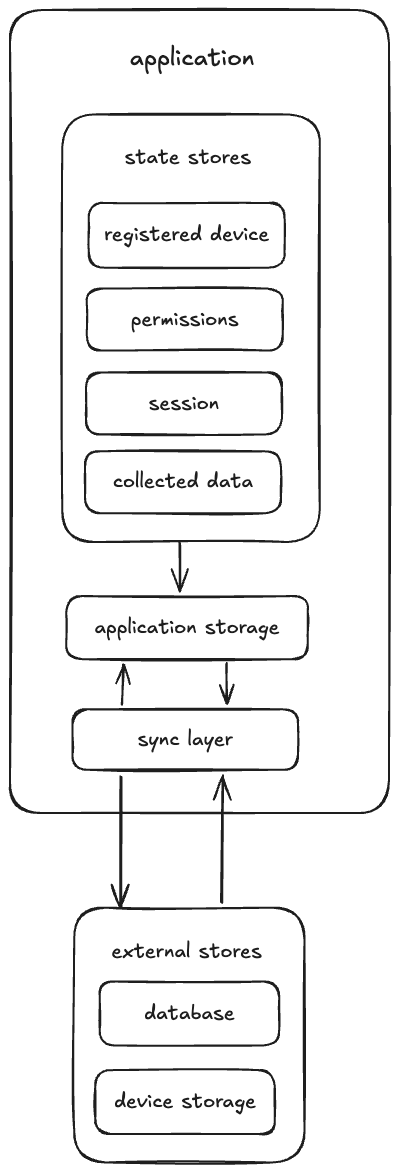 );This code sets up a new state synced to the database ‘device’ table for the current user. We wait for the session to exist before trying to sync, and we set a persist key of ‘device’ for local storage. Changes to each row will be synced between the users device and the database. This allows us to insert pseudo rows into the database while the device is offline, and when it comes back online the rows will be inserted.
